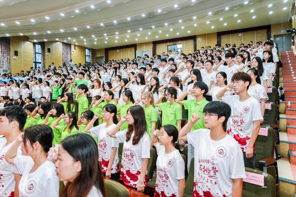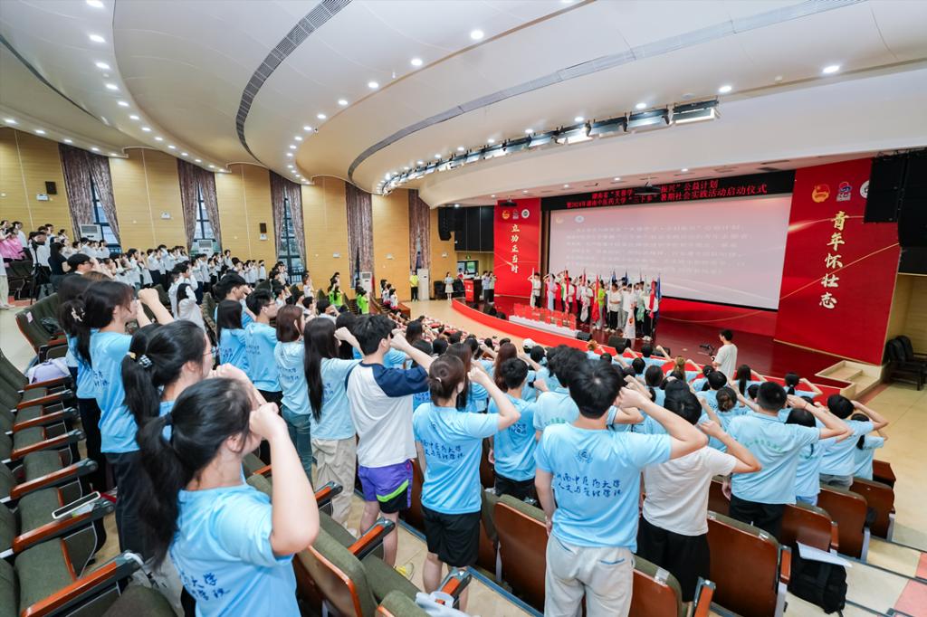在慷慨激昂的国歌声中,启动仪式拉开序幕。随后,廖菁为湖南省“芙蓉学子·乡村振兴”公益计划入选团队授旗。相关职能部门负责人为学校2024年“三下乡”暑期社会实践团队授旗。