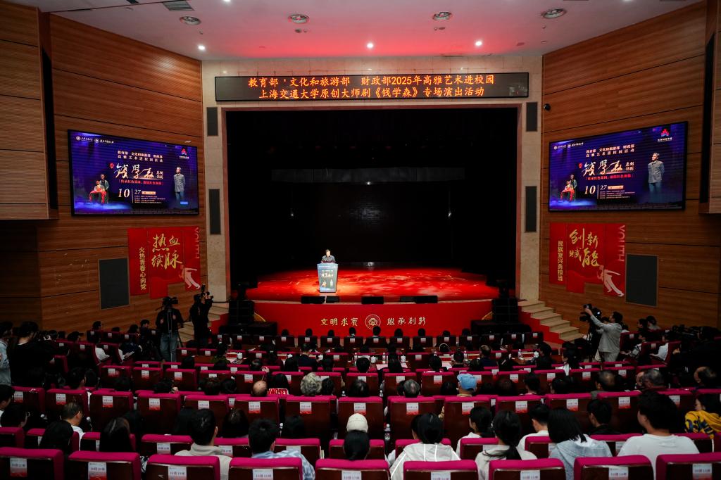 的校园因一场跨越山海的相遇而非比寻常。由教育部、文化和旅游部、财政部联合主办的2025年高雅艺术进校园——上海交通大学原创大师剧《钱学森》,在我校含浦校区学生活动中心精彩上演。