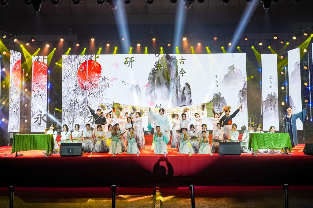 中医学院《望闻问切》将中医四诊巧妙融入舞台表达,带领观众步入充满东方智慧的生命现场。湖南省歌舞剧院《西汉导引图》通过刚柔并济的舞姿复原古代导引术,展现“天人合一”的养生哲学。由彭清华名医名家科普工作室出品的《杏林新编三字经》,在校友陈艺柳、教职工子弟及针灸推拿与康复学院的学生演绎下,将传统韵文与中医药知识巧妙融合,现场掌声雷动。
