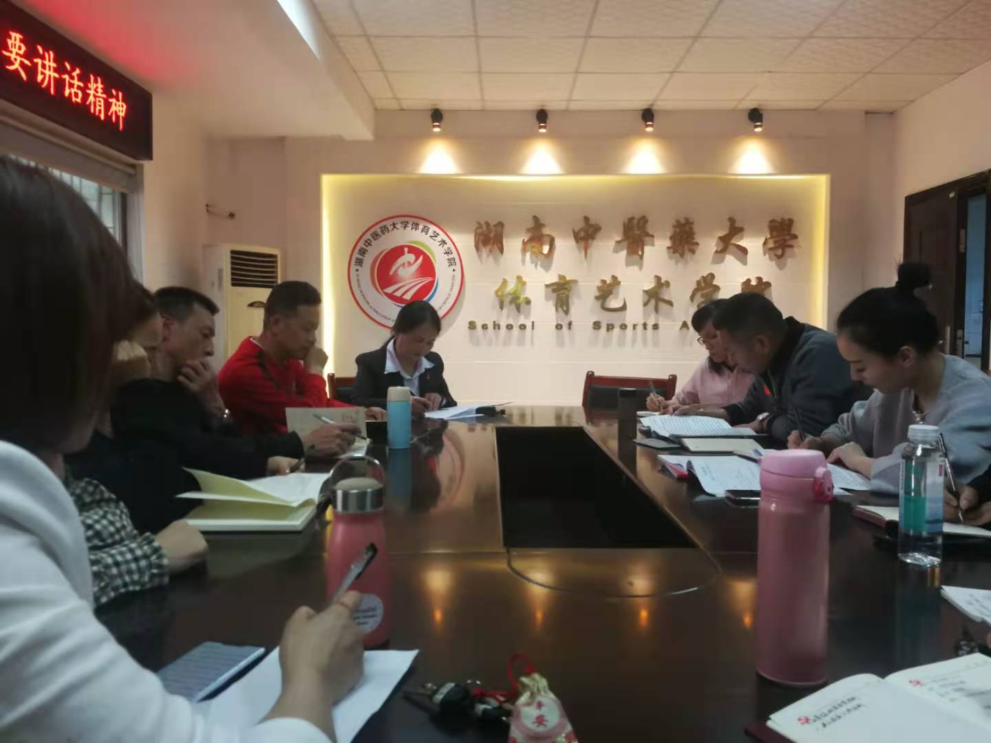 10月28日下午2:30,体育艺术学院全体党员在学院会议室集中学习习近平总书记视察湖南时在教育文化卫生体育领域专家代表座谈会上的讲话。