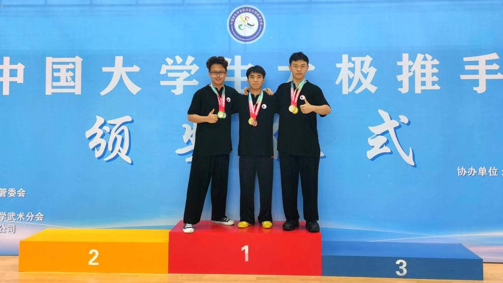 7月8日至13日,第4届中国大学生太极推手锦标赛在江苏省南通市举行,我校代表队在龙专领队,赵壮、任拓两位教练带领下荣获3金2银2铜,四至八名2项的优异成绩。其中口腔医学院聂阔宁同学荣获太极拳非遗项目(陈氏太极拳)冠军;医学院孔祥欣同学荣获太极非遗项目(陈氏太极拳)亚军和太极推手实战80公斤级季军;中医学院吴建杰同学荣获太极推手实战64公斤级亚军和太极非遗项目(杨式太极拳)季军;聂阔宁/孔祥欣组合勇夺双人太极活步推手项目冠军!