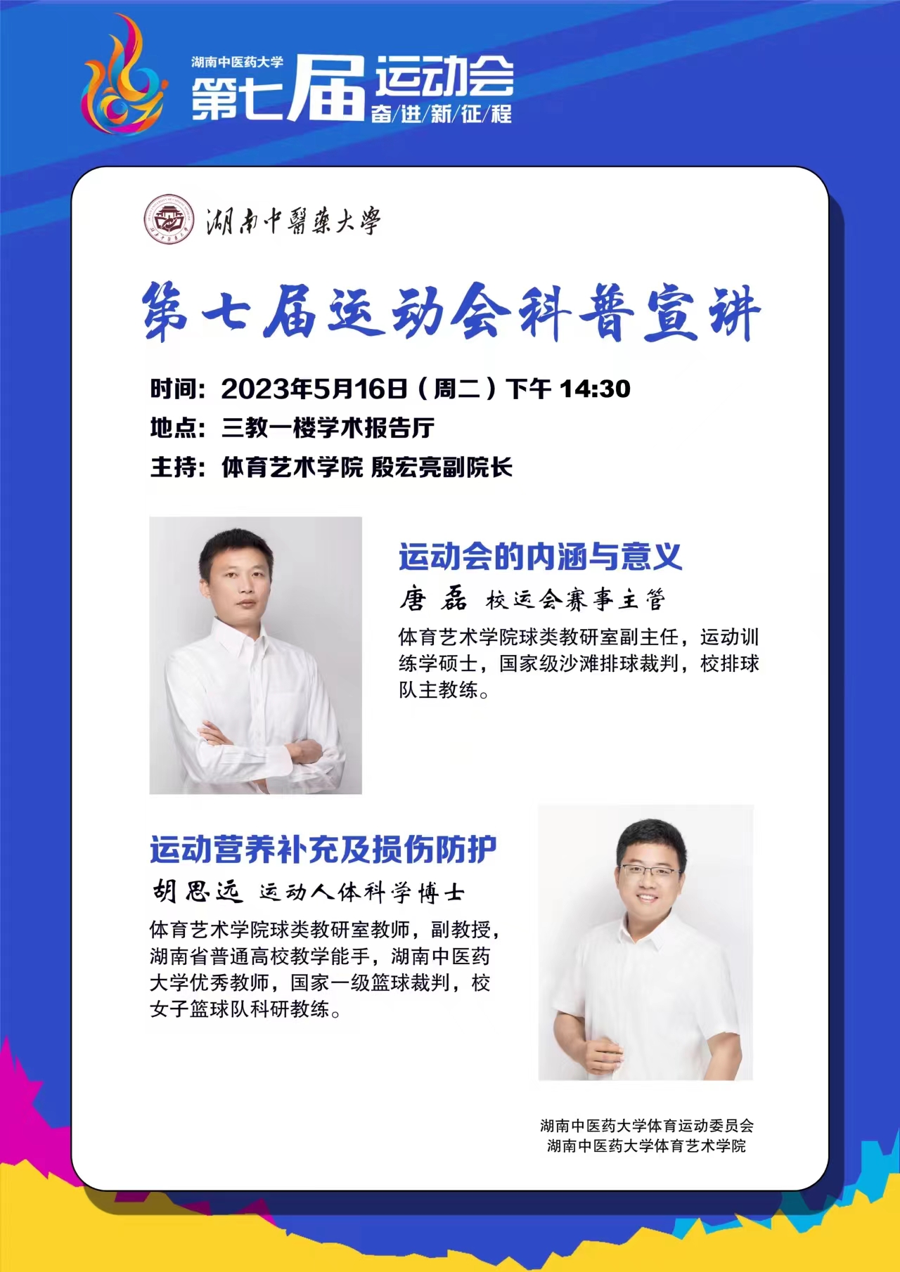 我院将于2023年5月16日14:30在三教一楼学术报告厅开展运动会科普宣讲活动,欢迎广大运动员、教练员参加。