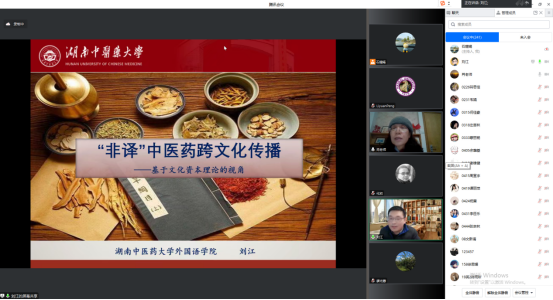 本次学术会议特邀了省内三位知名专家作了主旨报告:湘潭大学的胡强教授从研究英国哲学家罗素的著作出发,分析了其笔下的“中国问题”与西方困境,指出罗素思想中的文明互鉴的共同体意识和充满现代性反思的人文内涵。中南大学范武邱教授高屋建瓴地提出了中医术语外译的传播学途径建议;湖南工业大学彭利元教授则基于中华诸子百家经典《荀子》,探讨了其英译自传播价值取向。外国语学院院长廖光蓉教授从语言学角度作了中医学概念表达既意合又意向表达式体认研究的分享,外语学科带头人肖平教授则基于多年的研究和教学经验,就中医文化翻译发表了独到的见解。年轻的刘江教授、胡瑾副教授和丁颖副教授也分别围绕中医药跨文化传播及学习作了精彩发言。