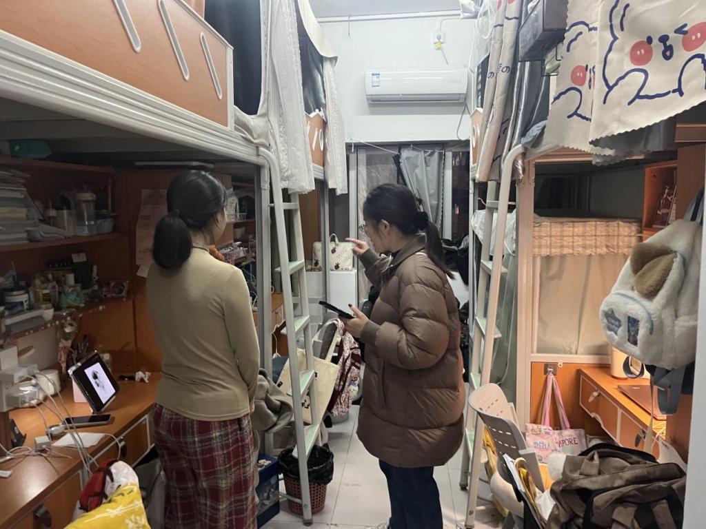 过程中,刘鑫副书记及学生科老师们对宿舍内的电器使用是否规范、门窗是否安全、卫生是否整洁及是否存有违规物品等方面逐一排查,对当前宿舍存在问题进行记录,同时向同学们普及宿舍安全知识,提醒同学们严格遵守相关学校安全管理规定。刘鑫表示:学生宿舍不仅是生活的空间,更是育人工作的重要阵地。营造优良的生活环境对于学风建设具有深远的影响。她提出,定期进行宿舍安全检查是提升学生健康意识、安全意识和纪律意识的有效途径,有助于及时发现并解决宿舍的卫生和安全隐患,从而加强学生教育管理。