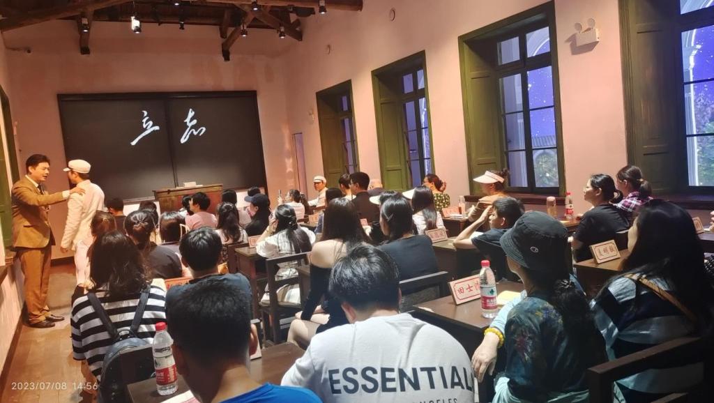 2023年7月8日,外国语学院职工党支部全体党员一起走上橘子洲头,走进《恰同学少年》剧场,直接以“学生”的身份穿越回在1931年的湖南省立第一师范,用1小时的沉浸体验,与毛泽东、蔡和森、向警予、陶斯咏等时代青年一道“问志、寻志、立志”,与百年前风华正茂的“同学少年”成为同桌、挚友,跟随“新青年”们激扬文字,重温了那段热血澎湃的红色记忆。