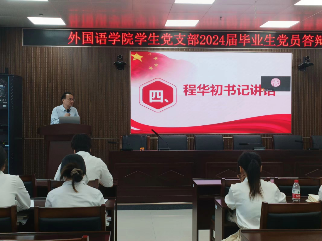 会议在庄严的国歌中拉开序幕,18名毕业生党员开展总结答辩,毕业生党员们通过PPT展示,从理想信念、专业学习、社会实践、人际交往等多个角度进行了自我总结。外国语学院党委书记程华初勉励毕业生党员离开校园走向社会后,依然要保持党员的新进行,持续发挥先锋模范作用。