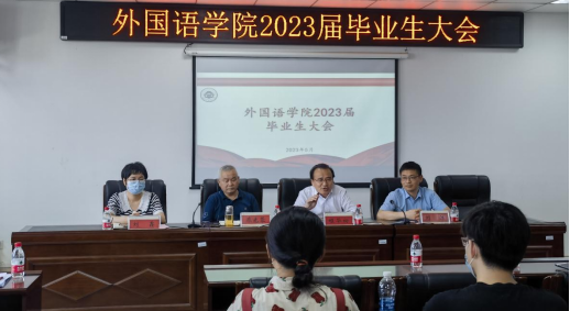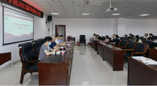 为深入贯彻落实党的二十大精神,落实就业优先战略,引导毕业生合理做好就业规划,5月29日下午,我院在含浦校区三号教学楼七楼706会议室召开2023届毕业生大会。外国语学院党委书记程华初、院长廖光蓉、副院长刘江、党委副书记刘鑫、辅导员龚思鹏、各毕业班班主任及学院部分老师出席了大会。本次大会由程华初书记主持。