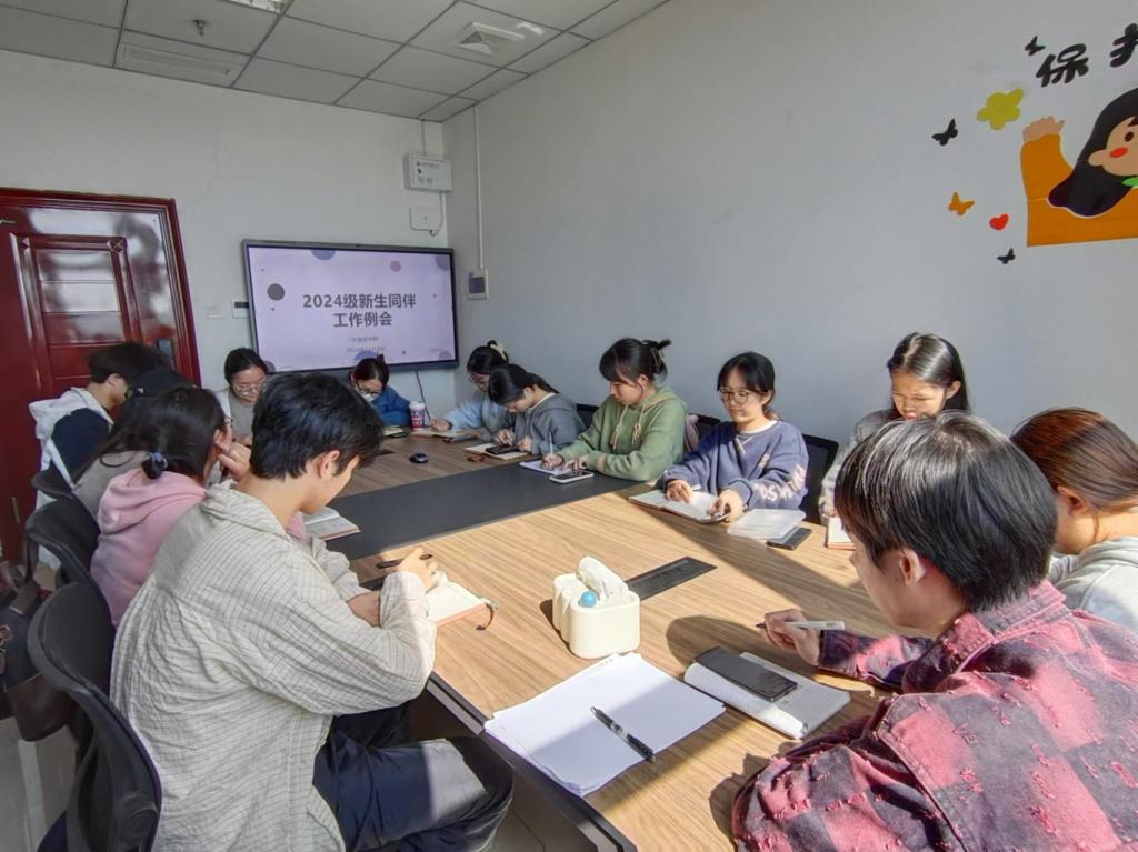 首次会议于2024年9月5日在三教1115举行。会议说明了新生报到流程的规范,对家困生认定、入学资格复查、档案装袋工作做了细节布置,强调了在军训晚自习期间同伴要做好日常管理,如规定部门招新的时间、禁止推销人员进入等。
