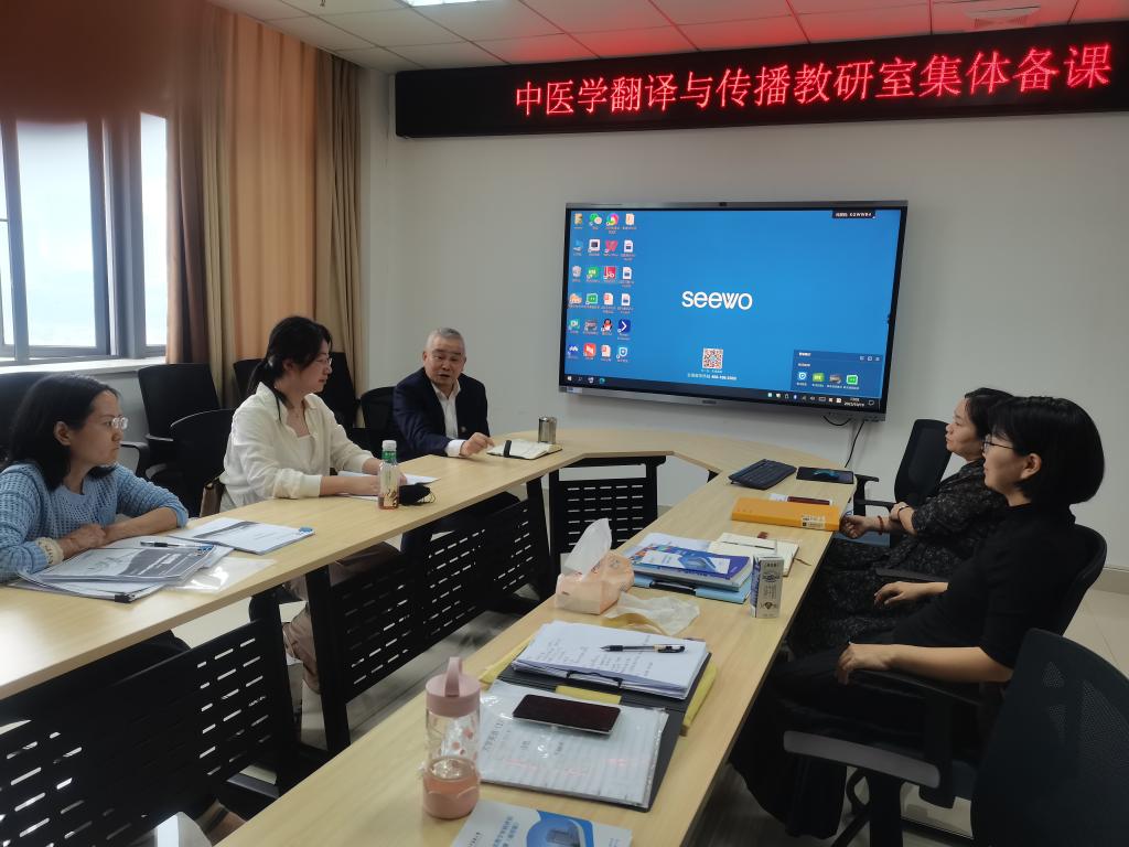 廖光蓉参加中医学翻译与传播教研室磨课活动10月19日下午,中医学翻译与传播教研室开展了集体磨课活动。活动由副主任黄杨主持。院长廖光蓉、主任丁颖和全体教师参加。活动现场活动中,每位老师现场对所授课程进行说课。之后,廖光蓉就如何突出以学生为中心、如何贯彻产出导向原则、如何持续改进,对每门说课的教学设计、PPT设计进行了全面而细致的指导。廖光蓉指出盛洁老师的《中医英语》教学思路清晰,建议对中医术语开展任务式教学,由学生分组课前预习,课堂上进行展示...