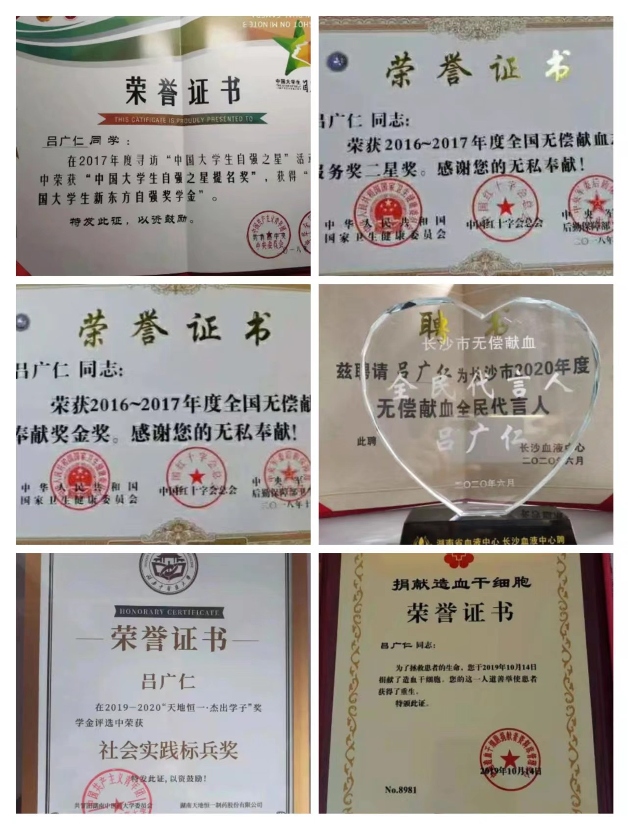 始,大学6年多的时间里积极参加无偿献血等公益活动,截止2021年4月,累计献血92次(全血2次,机采血小板90次),累计参加无偿献血志愿服务活动超300小时。2019年10月捐献造血干细胞,成功挽救一位白血病患者的生命,成为全国第8981例捐献造血干细胞志愿者。通过本人影响,直接带动身边同学参加机采血小板捐献超百人次,间接影响一大批同学加入到无偿献血的行列。