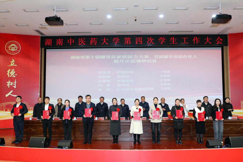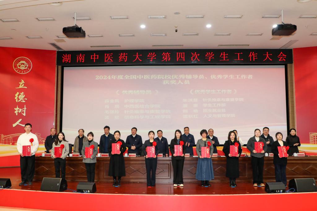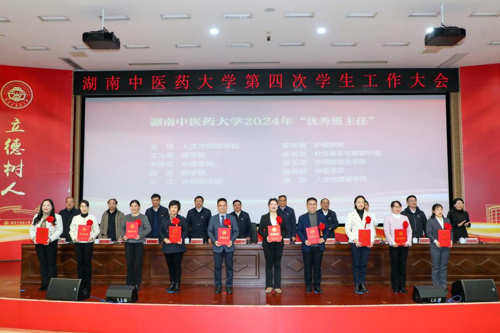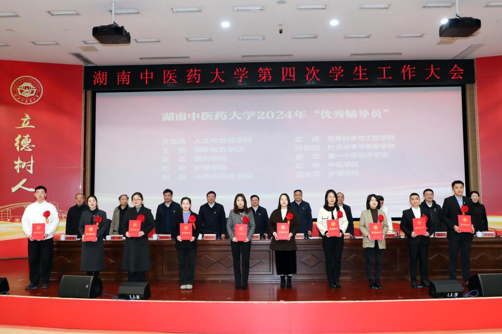大会进行了四轮颁奖,全体校领导为2023、2024年度全国中医药院校优秀学生工作者、优秀辅导员,湖南省高校辅导员工作研究与实践先进个人、学生工作研究与实践先进个人、湖南省第十届辅导员素质能力大赛、首届辅导员综合育人提升示范观摩活动获奖人员及我校2024年优秀班主任、优秀辅导员颁奖。