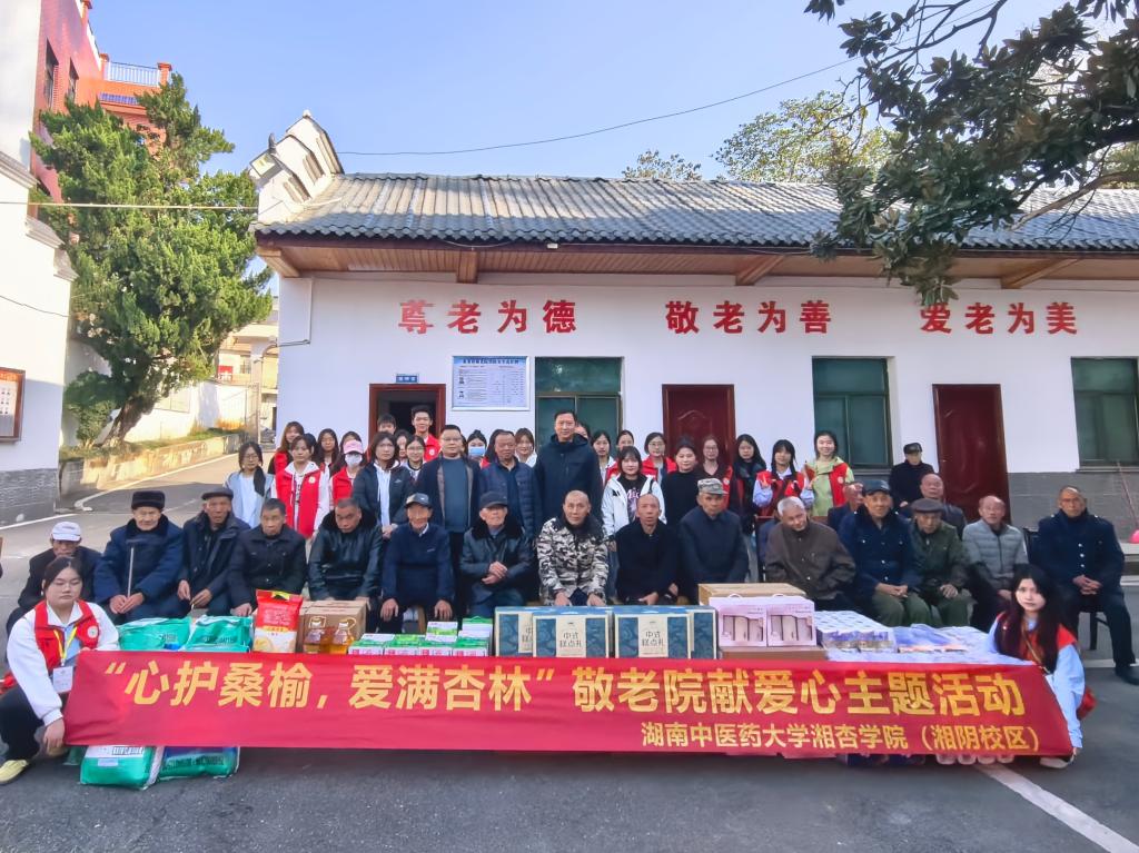 湘杏学院(湘阴校区)于2025年11月24日下午在湘阴县金龙镇敬老院成功举办“心护桑榆,爱满杏林”敬老院献爱心主题活动。湘杏学院党委副书记刘瑞斌、学工部副部长刘政伍及全体辅导员带领30余名青年志愿者,携带米面粮油、洗护用品等爱心物资,赴湘阴县金龙镇敬老院开展暖心服务。