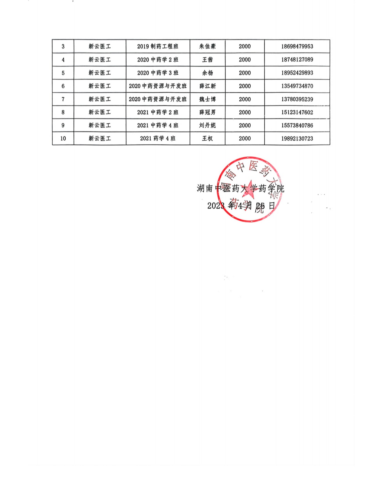 药学院“新云医工”奖学金名单公示