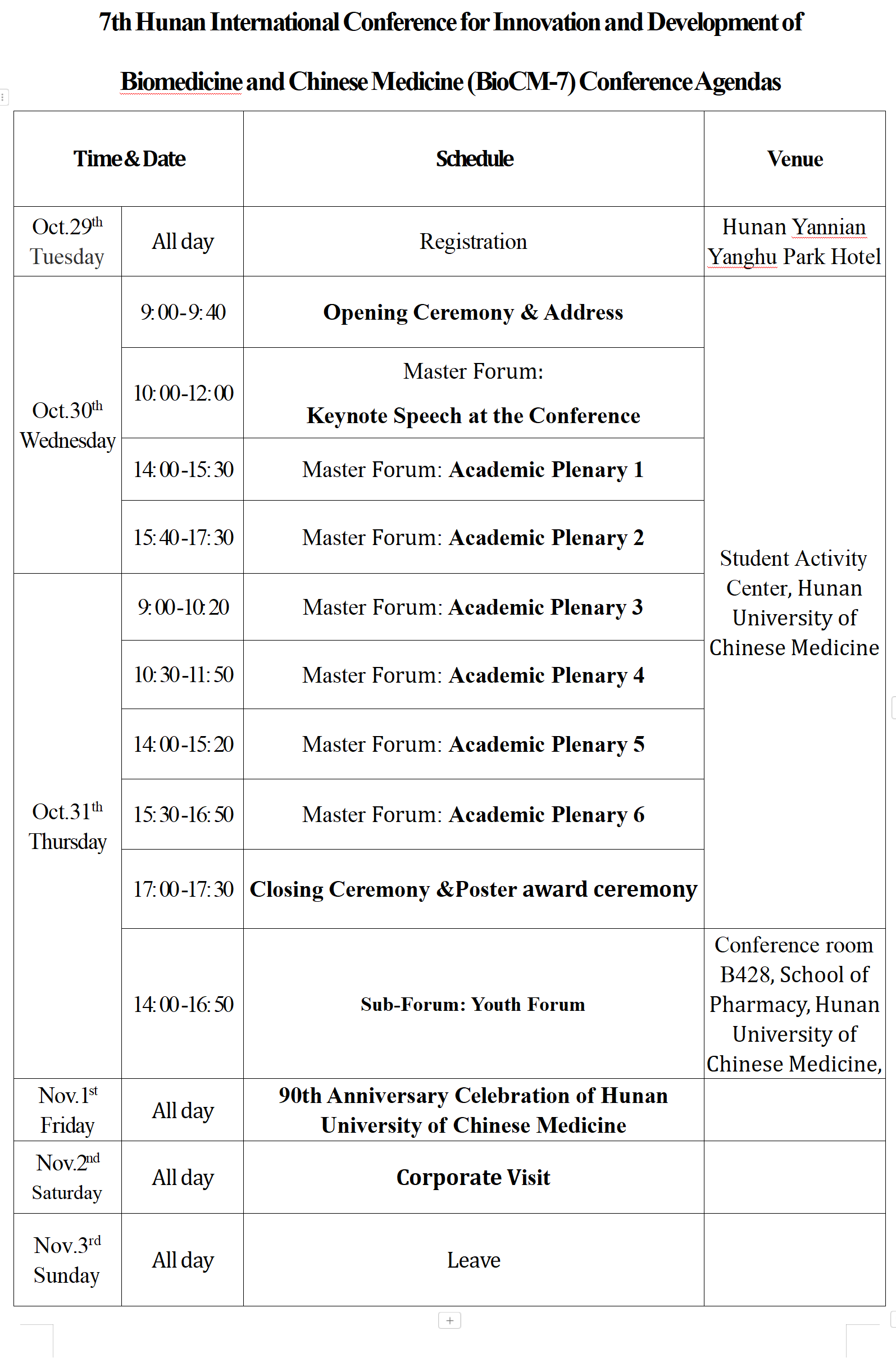 Nov.1st(Friday):90thAnniversary Celebration of Hunan University of Chinese Medicine
