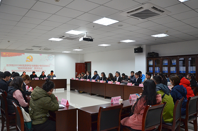 会议开始,首先由王健副书记宣读《2018年医学院党员学生与新疆籍少数民族新生结对共进活动“优秀对子”表彰决定》,接着李新蓉老师和艾力扎提老师为“优秀对子”们颁奖,以示嘉许。随后“优秀对子”代表们分享结对共进经验,提出要多关注结对同学的状态,多加交流,共同进步。刘莉老师宣读《2019年医学院党员学生与新疆籍少数民族新生结对共进活动实施方案》,李玉冰老师宣读本次结对名单。宣读完毕后,医学院党员学生与新疆籍少数民族新生在结对共进协议书上签字。紧接着党员代表马菘发言,谈及自己的一些心得和感受,给予同学们在生活和学习上的意见,鼓励同学们扩宽视野,关注前沿医学技术,在祖国医学事业发展中携手并进。新疆籍少数民族学生代表比拉力·图尔迪麦麦提发言,表达对国家实行的利于少数民族学生求学的政策的感激之情,并表示自己会继续努力学习,报效祖国。主持人李玉冰老师介绍一个名为“结对共进医家亲”的QQ群和一个微信小程序“小打卡”,分别用于结对同学们之间的交流和记录相处的点滴回忆。最后,李玉冰老师总结并宣布此次会议圆满结束。