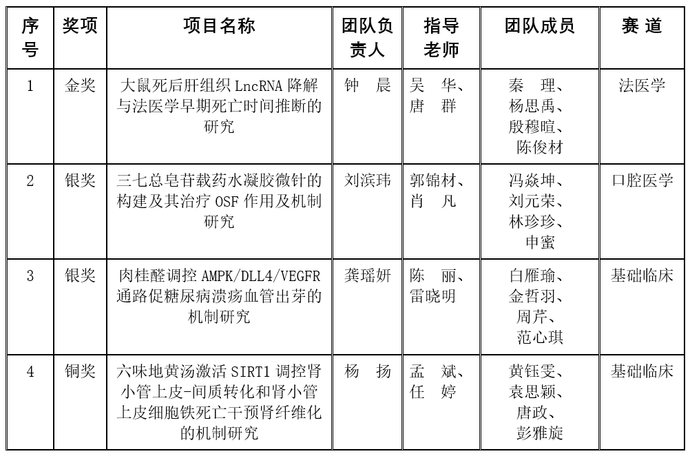 8月23-25日,第十届全国大学生基础医学创新研究暨实验设计论坛总决赛在中山大学成功举办,我院学子勇于创新,奋力拼搏,从项目选题、实验设计、现场汇报等多方面反复打磨作品、力求精益求精,经过激烈角逐,共获金奖1项,银奖2项、铜奖1项,获奖数目创历史新高,其中2021级临床医学2班钟晨同学团队参赛项目《大鼠死后肝组织LncRNA降解与法医学早期死亡时间推断的研究》荣获金奖,实现了学院在本赛事金牌“零的突破”。