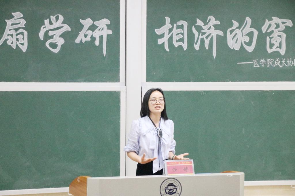 任婷向同学们展示了唐标老师近年来的科研成果,介绍了2017级4位在唐标老师指导下成功保研中南大学湘雅医学院附属第二医院的优秀同学。并强调了医学院成长协同育人系列讲座“三全育人”的目标,希望医学院学子学习榜样的力量,在学习和科研中不断成长。