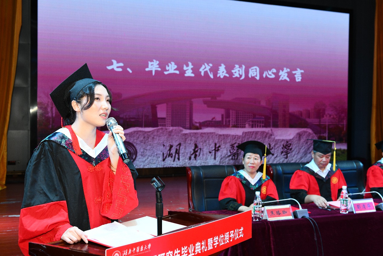 毕业生代表、中医管理学博士刘同心深情讲述了自己在湖中大的成长故事,并表示作为新一代中医药知识青年,将接过历史的接力棒,与时代同进步。