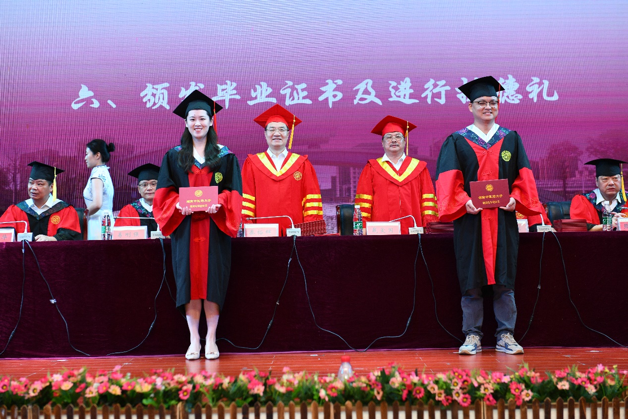 与会领导为全体硕、博士毕业生正冠拨穗、颁发学位证书。