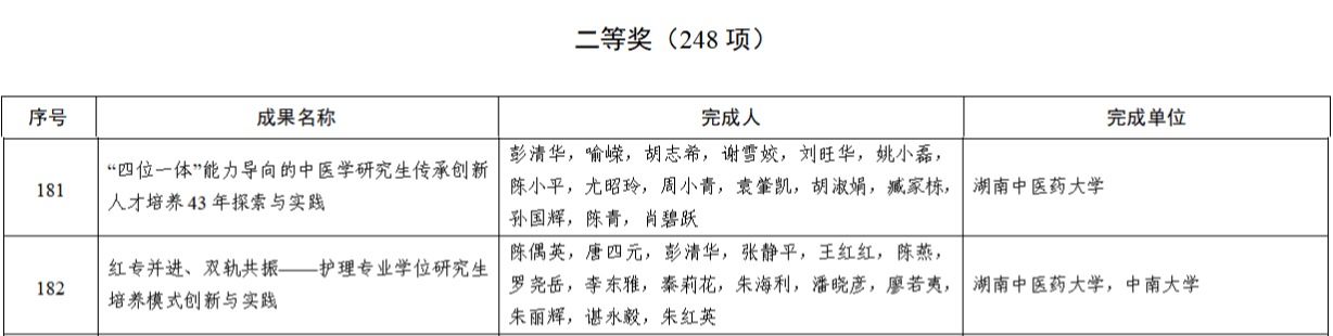 7月24日,教育部公布了关于批准2022年国家级教学成果奖获奖项目的决定,我校彭清华教授主持的《“四位一体”能力导向的中医学研究生传承创新人才培养43年探索与实践》和陈偶英教授主持的《红专并进、双轨共振—护理专业学位研究生培养模式创新与实践》均获高等教育(研究生)国家级教学成果奖二等奖。此次获奖是我校时隔30年国家级教学成果奖的又一次突破,是对我校研究生教育的高度肯定,是全国中医药类高校中唯一一所在本届国家级研究生教学成果奖中获得两项奖励的单位。