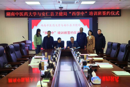 3月28日上午,在三教十楼会议室召开与安仁县卫健局“西学中”培训班座谈会并举行签约仪式。本次会议由针灸推拿与康复学院院长岳增辉主持,安仁县卫健局党委书记彭姝然、安仁县中医医院院长贺利湘、安仁县中医医院宣传科副主任张溢琼,针灸推拿与康复学院党委书记李继红、党委副书记刘余、办公室主任卢正伟、科教科科长阳晶晶出席本次会议。