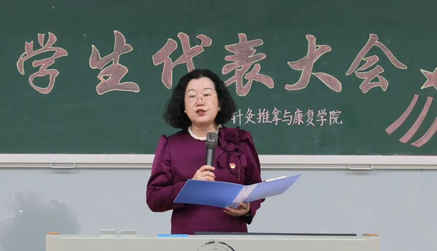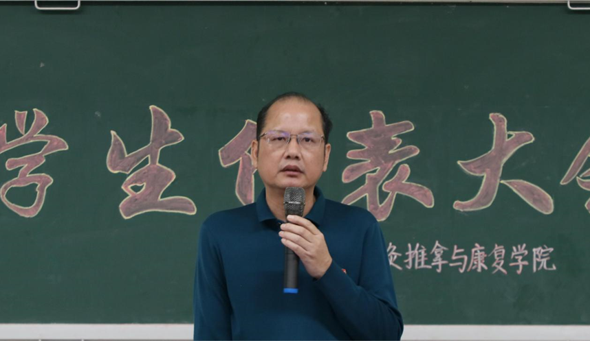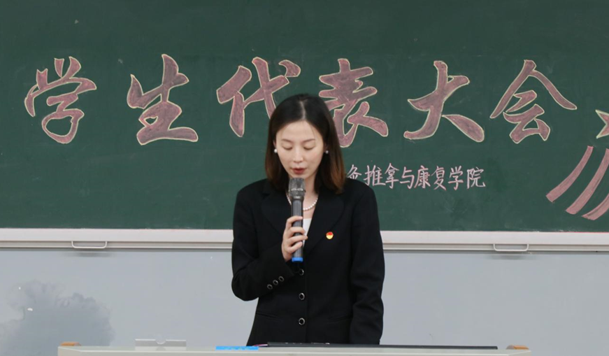针灸推拿与康复学院党委书记李继红致词。李继红书记肯定了此次大会的意义所在,他将青年人比作八九点钟的太阳,表明世界终究是青年人的,并对在场的团员、学生们提出了三点要求:一、要坚定政治信念,听党话跟党走。青年人应当将汗水洒在祖国的大地上。第一个百年奋斗目标已经实现,时代的发展与改变将交付于青年;二、青年人要大胆行事,青年终将改变和发展时代;三、各位团员、学生代表要团结合作,树立良好的榜样作用。