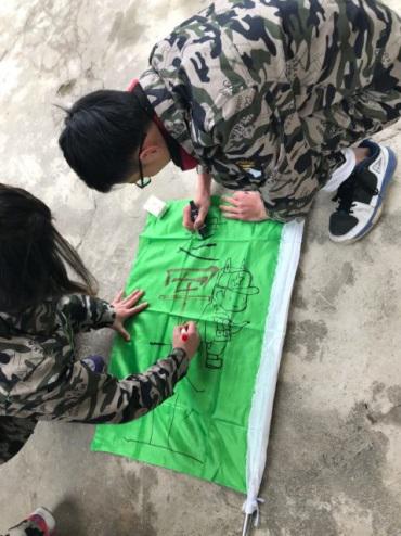 活动开始前,教练通过报数游戏将大家分为四个组,接下来就是团队的组建工作,每个队围在一起想口号,画队旗,其乐融融。