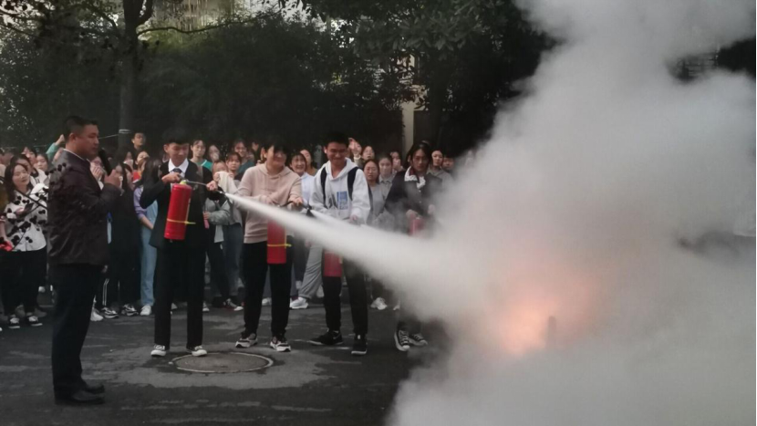 紧接着在消防安全员吴悔老师的指导下,同学们实践操作干粉灭火器,对准火源进行灭火。