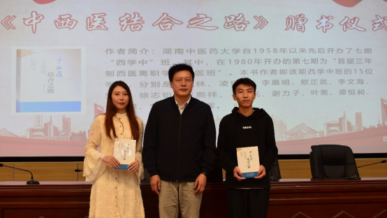 成绍武为本科生代表和研究生代表颁发《中西医结合之路》。本书记载了半岛手机版官网登录 中西医结合学科的发展历程和重大事件,通过“首届三年制西医离职学习中医班”15位学员回忆录的方式呈现了1980年在读期间对中西医结合的理解感悟及往后至今在工作岗位中对中西医结合理论防治疾病的运用体会。