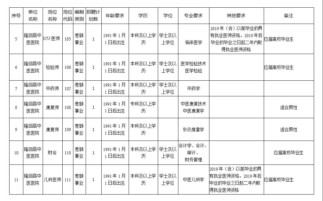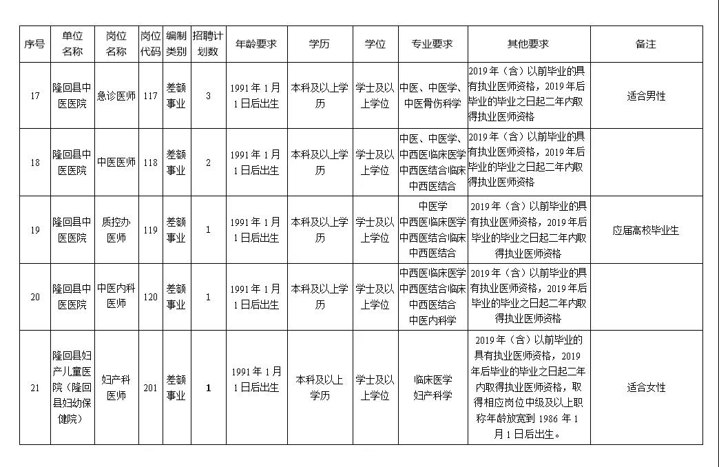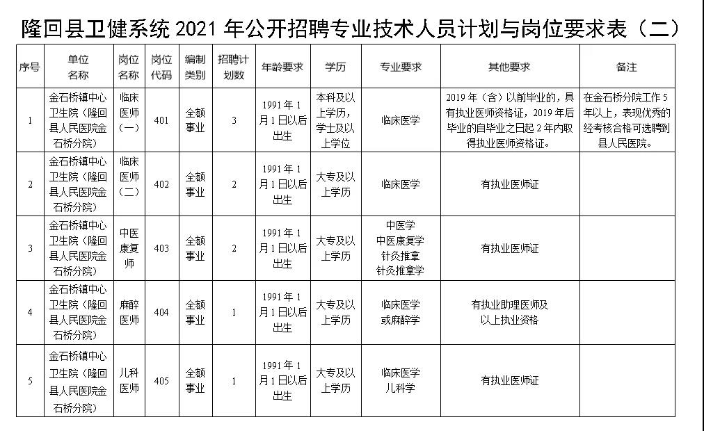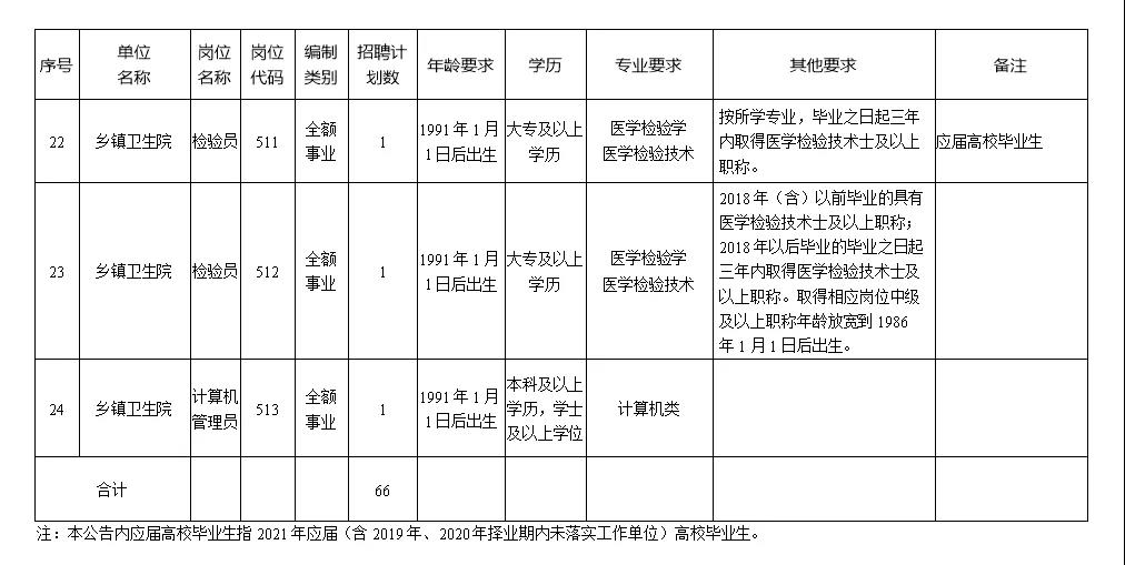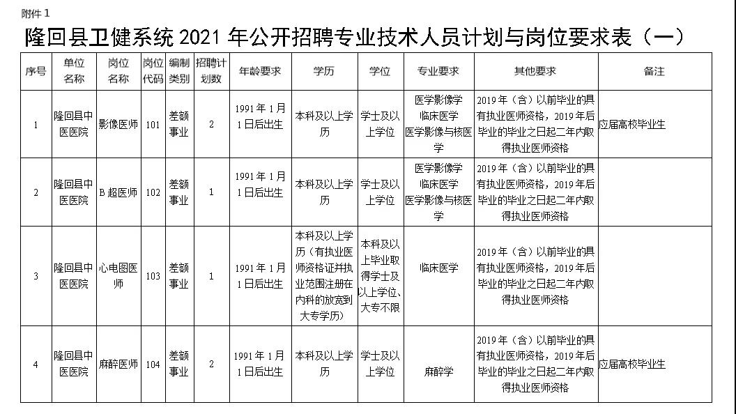 为进一步优化医疗卫生专业人才队伍,提高专业人员素质,推动我县卫生健康事业可持续发展,经研究决定面向社会公开招聘医疗卫生单位专业技术人员66名,其中县直医疗单位31名,乡镇卫生院35名,现就招聘有关事项公告如下: 一、招聘原则 坚持德才兼备的用人标准和公开、公平、竞争、择优的原则。 二、招聘岗位、计划及岗位要求(见附件1) 三、报考条件 (一)基本条件 1.具有中华人民共和国国籍; 2.遵守宪法和法律,具有良好的品行和职业道德; 3.身体健康,具备履行岗位职责的身体、心理条件; 4.具备应聘岗位所需的条件(见附件1)。 (二)不能报考人员 1.隆回县卫健系统在编工作人员; 2.曾因犯罪受过刑事处罚的人员或曾被开除公职的人员; 3.尚未解除党纪、政纪处分或正在接受纪律审查的人员; 4.涉嫌违法犯罪正在接受司法调查尚未做出结论的人员; 5.在各类事业单位公开招聘中因违反《事业单位公开招聘违纪违规行为处理规定》被记入事业单位公开招聘应聘人员诚信档案库,且记录期限未满的人员; 6.法律、政策规定的其他不能报考或不得聘用至事业单位工作的人员。 7.2021年毕业的公费定向培养医学类毕业生。 8.在隆回县卫健系统服务期未满的辞职人员。 四、招聘程序 本次招聘按照发布招聘公告、报名和资格初审、考试、体检、考察、拟聘公示、备案及聘用等程序进行。 (一)发布招聘公告。招聘公告在隆回县人民政府门户网站等媒体发布,时间不少于7个工作日。 (二)报名及资格初审。 1.报名时间:2021年11月11日至11月13日(上午8:00-12:00,下午14:30-17:30)。 2.报名地点及方式:隆回县人力资源和社会保障局3栋1楼大厅,采用现场报名的方式进行。 3.报名程序及要求:①每位考生限报一个岗位,多报或重报无效。②报考者须携带1寸近期同底免冠半身彩色照片3张,本人正式有效身份证、学历和学位证、岗位要求的其他证件等材料原件及复印件报名。③国外留学所取得的学历学位须经教育部认证后才可报名。④报名时对报考人员进行资格初审,报考人员须如实填写《隆回县事业单位公开招聘人员报名表》(见附件2),考生必须提供真实材料,不得弄虚作假,一经发现弄虚作假行为者,取消报名资格,初审合格后准予报名。 4.报名比例:每个岗位有效报名人数与招聘计划数的比例不得低于3:1,达不到开考比例的,则相应核减或取消招聘计划数。专业特殊或确实难以形成竞争的岗位、报考基层乡镇卫生院的岗位达不到开考比例需开考的,报隆回县事业单位公开招聘工作人员领导小组批准后相应调整开考比例,并予以公示。凡经批准降低开考比例的岗位,或实际参考人数未达到开考比例的岗位,综合成绩不低于60分,低于60分者不能进入下一招聘程序。 5.准考证领取时间及地点:准考证领取时间和地点在“隆回县人民政府门户网站”另行发布,不再电话通知,报考者须持本人身份证到指定地点领取准考证,逾期不领视同放弃考试资格。 6.疫情防控期间,请报考人员自觉佩戴好口罩,做好个人卫生防护,严格服从招聘考试现场防疫工作管理。 (三)考试 考试方式:所有招聘岗位须进行专业理论和操作知识考试,不再操作面试,专业理论和操作知识考试均采取纸质化考试,成绩满分各为100分,专业理论成绩占综合成绩的70%,操作知识成绩占综合成绩的30%,考试成绩在隆回县人民政府门户网站公布。 (四)体检。根据综合成绩从高分到低分按招聘计划人数等额确定体检对象。综合成绩相同的按专业理论成绩高低、第一学历高低顺序依次排名。体检参照《公务员录用体检通用标准(试行)》等有关规定执行。考生对非当日、非当场复检的体检项目结果有疑问时,可由本人在体检结论下达七天内提出书面复检申请,就不合格项目进行一次复检,以复检结论为准。 (五)考察。体检合格后,由县人力资源和社会保障局、用人单位主管部门会同相关部门对体检合格人员进行考察。考察参照国家公务员政审考察标准实施。考察结果及拟聘人员名单经用人单位主管部门核定后,报县人力资源和社会保障局,由县人力资源和社会保障局统一对外公布拟聘人员名单。已就业的应聘人员须于体检合格后,进入考察前由本人提供原工作单位同意解除人事关系的证明,否则不予考察和聘用。 (六)公示。考察合格的拟聘人员将在隆回县人民政府门户网站进行公示,公示期为7个工作日,公示期间如被实名举报者,经查证属实,取消聘用资格。 (七)聘用。经考试、体检、考察、公示无异议的人员由用人单位按相关规定和程序按新聘用人员办理进人和聘用手续,试用期按国家相关政策执行。试用期满经考核合格的,予以正式聘用;试用期内或试用期满考核不合格或发现隐瞒聘前病史且身体条件不符合招聘岗位要求的人员,取消聘用资格。 除按《隆回县卫健系统2021年公开招聘专业技术人员计划与岗位要求表》规定在报名时须要求取得相应执业资格证外,其他聘用人员按照《隆回县卫健系统2021年公开招聘专业技术人员计划与岗位要求表》中规定的时间内未取得对应岗位要求的执业资格者,解除聘用。所有岗位的聘用人员须在招聘单位服务满5年(含试用期)以上,未满服务期的,不得申请向隆回县内其他单位及隆回县外交流调动,否则解除聘用合同、终止人事关系,并由考生承担相应违约金及责任。 本次招聘除体检、考察阶段因