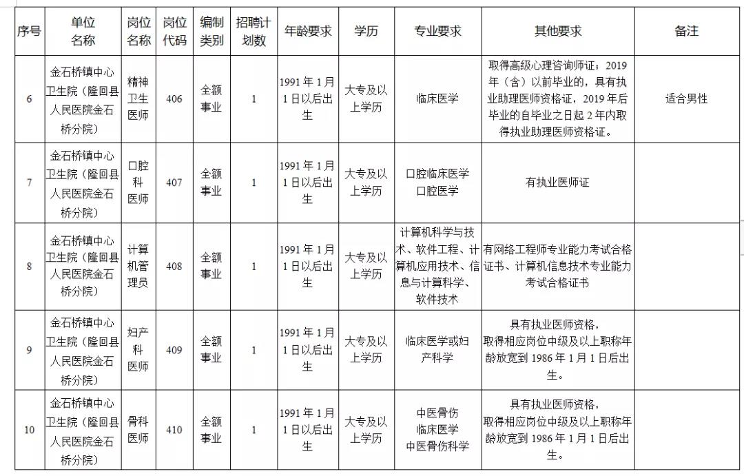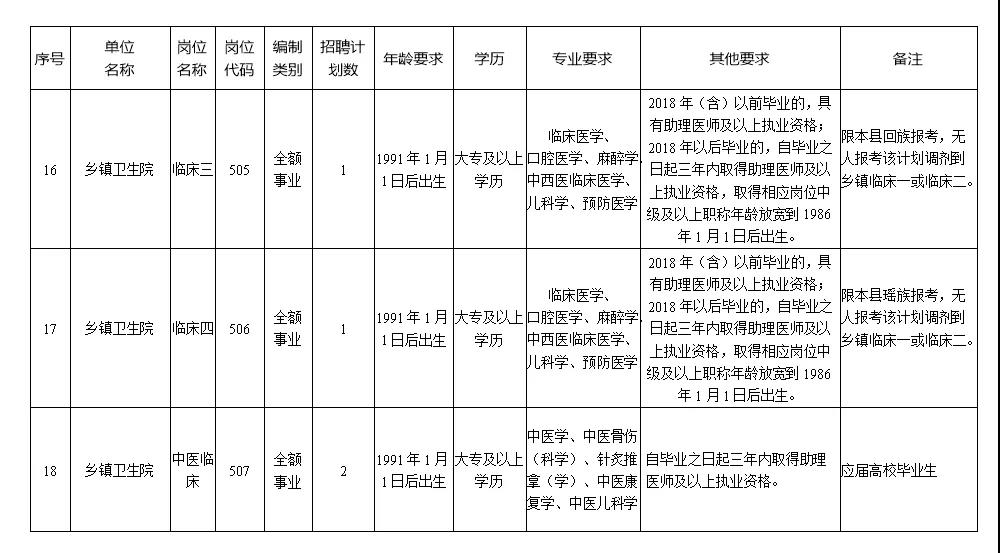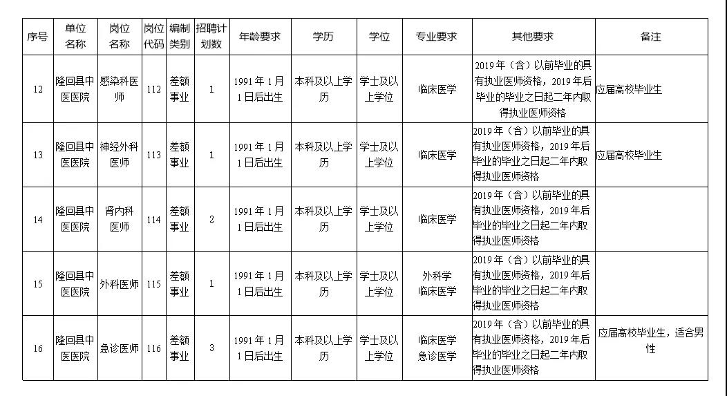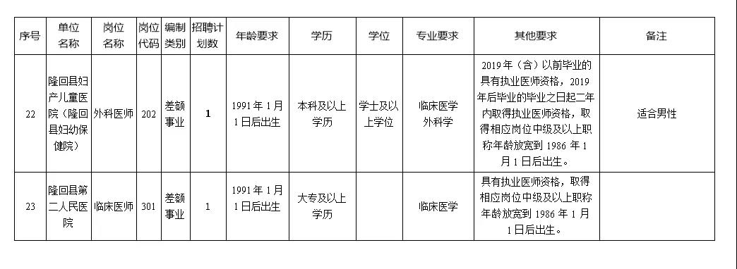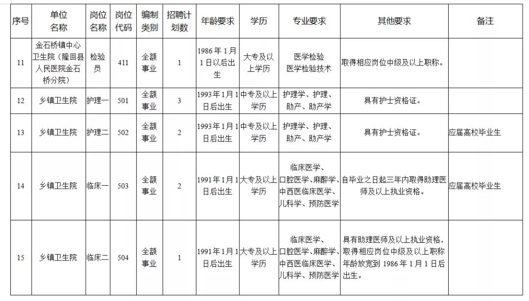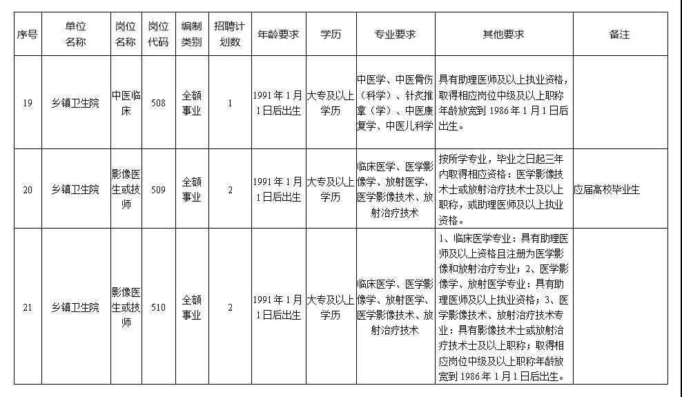 为进一步优化医疗卫生专业人才队伍,提高专业人员素质,推动我县卫生健康事业可持续发展,经研究决定面向社会公开招聘医疗卫生单位专业技术人员66名,其中县直医疗单位31名,乡镇卫生院35名,现就招聘有关事项公告如下: 一、招聘原则 坚持德才兼备的用人标准和公开、公平、竞争、择优的原则。 二、招聘岗位、计划及岗位要求(见附件1) 三、报考条件 (一)基本条件 1.具有中华人民共和国国籍; 2.遵守宪法和法律,具有良好的品行和职业道德; 3.身体健康,具备履行岗位职责的身体、心理条件; 4.具备应聘岗位所需的条件(见附件1)。 (二)不能报考人员 1.隆回县卫健系统在编工作人员; 2.曾因犯罪受过刑事处罚的人员或曾被开除公职的人员; 3.尚未解除党纪、政纪处分或正在接受纪律审查的人员; 4.涉嫌违法犯罪正在接受司法调查尚未做出结论的人员; 5.在各类事业单位公开招聘中因违反《事业单位公开招聘违纪违规行为处理规定》被记入事业单位公开招聘应聘人员诚信档案库,且记录期限未满的人员; 6.法律、政策规定的其他不能报考或不得聘用至事业单位工作的人员。 7.2021年毕业的公费定向培养医学类毕业生。 8.在隆回县卫健系统服务期未满的辞职人员。 四、招聘程序 本次招聘按照发布招聘公告、报名和资格初审、考试、体检、考察、拟聘公示、备案及聘用等程序进行。 (一)发布招聘公告。招聘公告在隆回县人民政府门户网站等媒体发布,时间不少于7个工作日。 (二)报名及资格初审。 1.报名时间:2021年11月11日至11月13日(上午8:00-12:00,下午14:30-17:30)。 2.报名地点及方式:隆回县人力资源和社会保障局3栋1楼大厅,采用现场报名的方式进行。 3.报名程序及要求:①每位考生限报一个岗位,多报或重报无效。②报考者须携带1寸近期同底免冠半身彩色照片3张,本人正式有效身份证、学历和学位证、岗位要求的其他证件等材料原件及复印件报名。③国外留学所取得的学历学位须经教育部认证后才可报名。④报名时对报考人员进行资格初审,报考人员须如实填写《隆回县事业单位公开招聘人员报名表》(见附件2),考生必须提供真实材料,不得弄虚作假,一经发现弄虚作假行为者,取消报名资格,初审合格后准予报名。 4.报名比例:每个岗位有效报名人数与招聘计划数的比例不得低于3:1,达不到开考比例的,则相应核减或取消招聘计划数。专业特殊或确实难以形成竞争的岗位、报考基层乡镇卫生院的岗位达不到开考比例需开考的,报隆回县事业单位公开招聘工作人员领导小组批准后相应调整开考比例,并予以公示。凡经批准降低开考比例的岗位,或实际参考人数未达到开考比例的岗位,综合成绩不低于60分,低于60分者不能进入下一招聘程序。 5.准考证领取时间及地点:准考证领取时间和地点在“隆回县人民政府门户网站”另行发布,不再电话通知,报考者须持本人身份证到指定地点领取准考证,逾期不领视同放弃考试资格。 6.疫情防控期间,请报考人员自觉佩戴好口罩,做好个人卫生防护,严格服从招聘考试现场防疫工作管理。 (三)考试 考试方式:所有招聘岗位须进行专业理论和操作知识考试,不再操作面试,专业理论和操作知识考试均采取纸质化考试,成绩满分各为100分,专业理论成绩占综合成绩的70%,操作知识成绩占综合成绩的30%,考试成绩在隆回县人民政府门户网站公布。 (四)体检。根据综合成绩从高分到低分按招聘计划人数等额确定体检对象。综合成绩相同的按专业理论成绩高低、第一学历高低顺序依次排名。体检参照《公务员录用体检通用标准(试行)》等有关规定执行。考生对非当日、非当场复检的体检项目结果有疑问时,可由本人在体检结论下达七天内提出书面复检申请,就不合格项目进行一次复检,以复检结论为准。 (五)考察。体检合格后,由县人力资源和社会保障局、用人单位主管部门会同相关部门对体检合格人员进行考察。考察参照国家公务员政审考察标准实施。考察结果及拟聘人员名单经用人单位主管部门核定后,报县人力资源和社会保障局,由县人力资源和社会保障局统一对外公布拟聘人员名单。已就业的应聘人员须于体检合格后,进入考察前由本人提供原工作单位同意解除人事关系的证明,否则不予考察和聘用。 (六)公示。考察合格的拟聘人员将在隆回县人民政府门户网站进行公示,公示期为7个工作日,公示期间如被实名举报者,经查证属实,取消聘用资格。 (七)聘用。经考试、体检、考察、公示无异议的人员由用人单位按相关规定和程序按新聘用人员办理进人和聘用手续,试用期按国家相关政策执行。试用期满经考核合格的,予以正式聘用;试用期内或试用期满考核不合格或发现隐瞒聘前病史且身体条件不符合招聘岗位要求的人员,取消聘用资格。 除按《隆回县卫健系统2021年公开招聘专业技术人员计划与岗位要求表》规定在报名时须要求取得相应执业资格证外,其他聘用人员按照《隆回县卫健系统2021年公开招聘专业技术人员计划与岗位要求表》中规定的时间内未取得对应岗位要求的执业资格者,解除聘用。所有岗位的聘用人员须在招聘单位服务满5年(含试用期)以上,未满服务期的,不得申请向隆回县内其他单位及隆回县外交流调动,否则解除聘用合同、终止人事关系,并由考生承担相应违约金及责任。 本次招聘除体检、考察阶段因