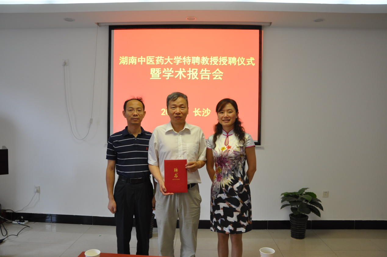 6月25日上午,黄熙客座教授聘任仪式暨学术报告会在我校中西医结合学院举行,大学副校长,中西医结合基础学科带头人葛金文教授,组织人事部部长廖菁出席授聘仪式。中西医结合学院院长邓奕辉教授主持报告会。学院、学科教师及研究生参加了报告会。