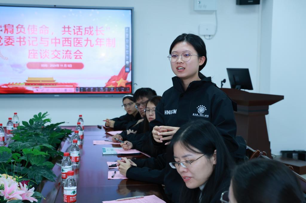2024年11月5日,大学党委书记戴爱国走进中西医结合学院会议室,与2024级中西医临床医学专业(拔尖班、5+4一体化)的新生们共同举办了一场以“肩负使命,共话成长”为主题的座谈会。此次座谈会由学院党委书记张国民主持,学院领导、教师代表以及学生处、教务处、校团委等相关领导参加了此次座谈。