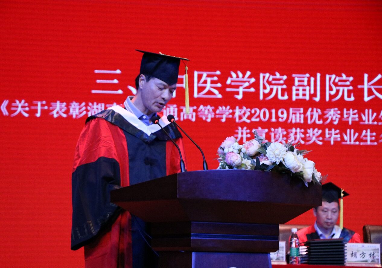 最先进行的毕业典礼上,由党委副书记李晓红主持,宣布本次毕业典礼正式开始并发表讲话,表达对于毕业生们的殷切期望与祝福。接着全体起立,奏唱国歌。中医学院副院长胡志希宣读《关于表彰湖南省普通高等学校2019届优秀毕业生和创新创业优秀毕业生的通报》及获奖毕业生名单,谷丽瑶、张舒燕、尹炼、白绍锴、周思远、徐艺璇、徐晴、田秋慧、刘慧慧、施月、赵丹妮、杨华、吴静远、谭忠伟、蔡元元获优秀毕业生称号;邓显光、战俊邑获创业创新优秀毕业生奖,并由党委书记刘富林为他们进行颁奖。随后优秀毕业生代表赵丹妮与教师代表李鑫辉发表精彩发言,并进行授予学士学位环节,教师代表为毕业生们行拨穗礼。