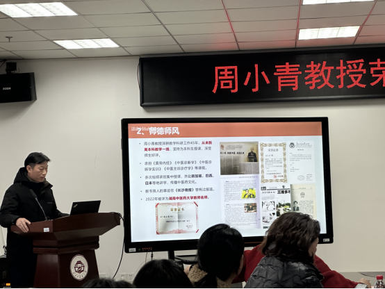 最后中医学院院长邓奕辉发表讲话,她高度评价了周小青教授的职业生涯和工作成就。她表示,周小青教授是学院的一面旗帜,他用自己的行动诠释了教师的责任和担当,他的工作精神和奉献精神,将激励年轻教师不断前行。同时,她也希望周小青教授能够一如既往地关心和支持学院的发展,为学院的未来发展出谋划策。