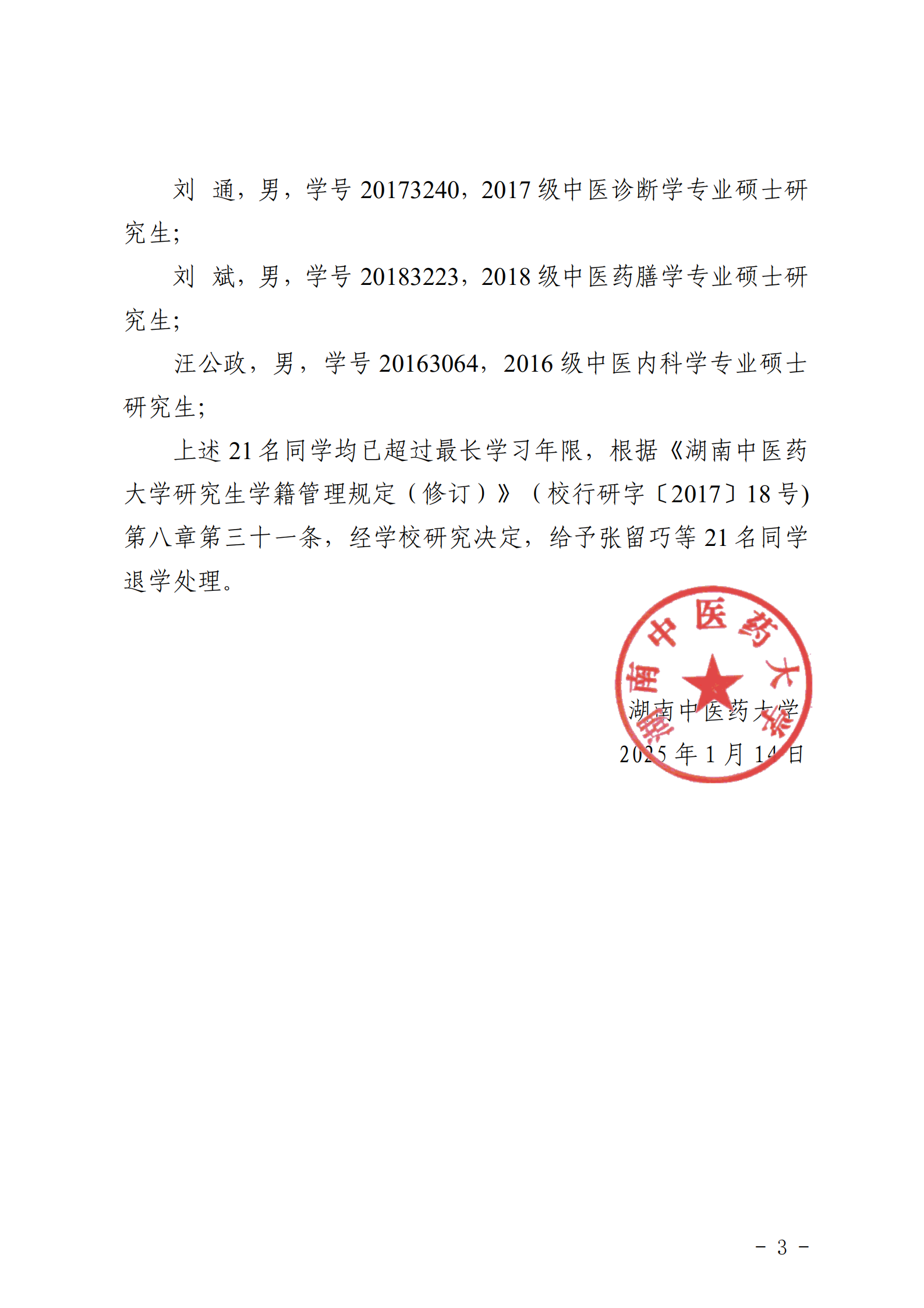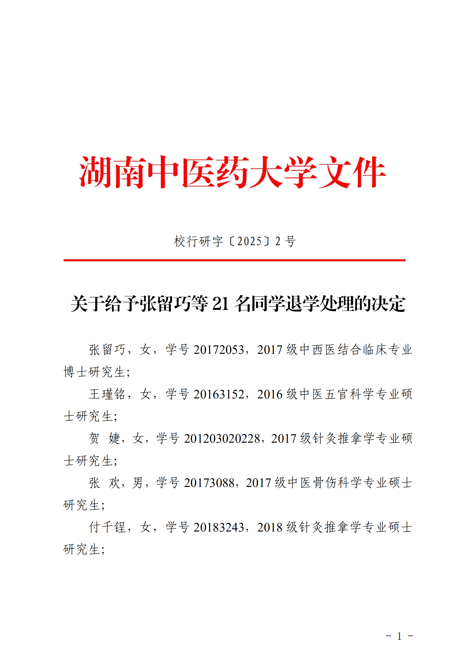 关于给予张留巧等 21 名同学退学处理的决定