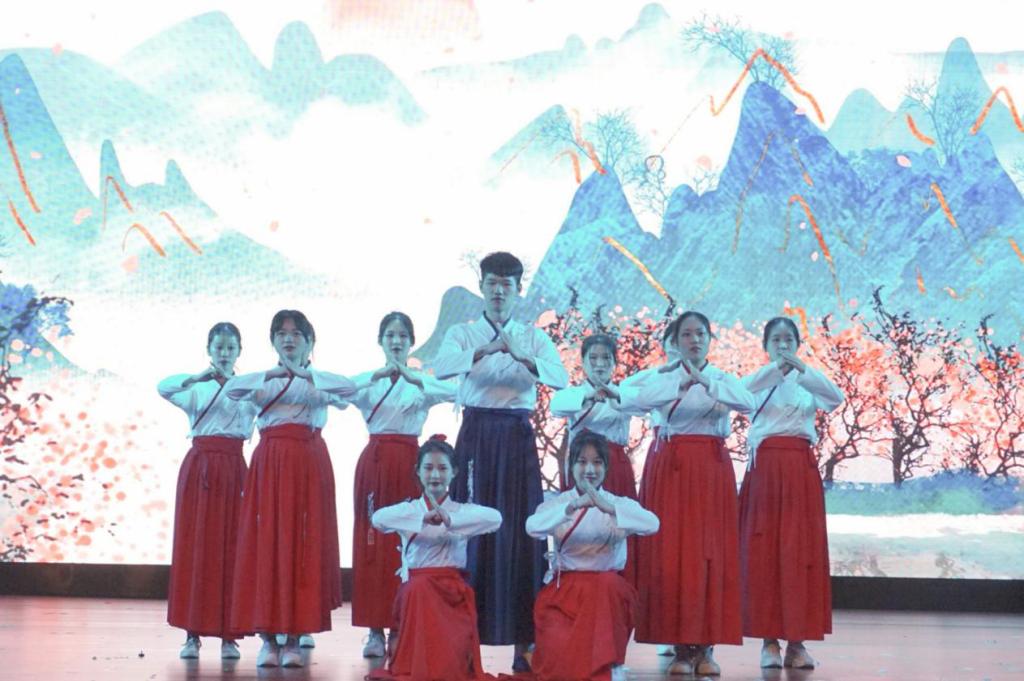 各参赛队伍表演展示完毕后,中医学院文礼部舞蹈队带来表演《上山+芒种》。