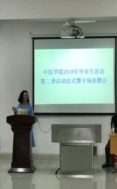 大学招生就业处副处长曹一瑜、中医学院党委书记刘富林、大学招生就业处就业中心老师吴迪、熊桦等一同参会。启动仪式由中医学院党委副书记李晓红主持,中医学院党委书记刘富林致开幕词,热烈欢迎各用人单位来我校招聘人才,希望我(校)院学生能够拓宽就业思路,降低期望值,放下身段,多从基层干起。致词结束后,刘富林书记宣布中医学院2018年毕业生招聘季系列活动正式启动。