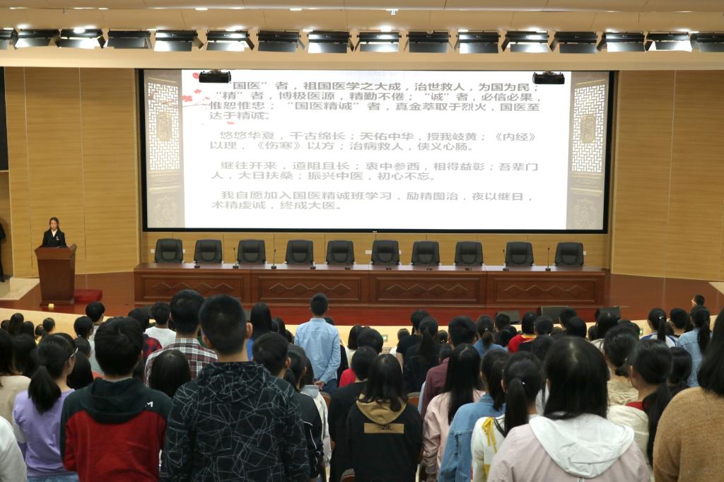 最后,2017、2018级国医精诚班同学集体诵读国医精诚班核心精神:“国医”者,祖国医学之大成,治世救人,为国为民;“精”者,博极医源,精勤不倦;“诚”者,必信必果,惟恕惟忠;“国医精诚”者,真金萃取于烈火,国医至达于精诚。